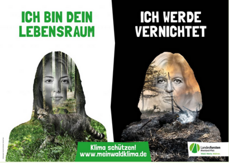 Die Initiative „MeinWaldKlima“ arbeitet dabei mit einer klaren Bildsprache. Sie zeigt, was der Wald alles für uns leistet und stellt dem gegenüber, wie der Wald durch die Klimakrise zerstört wird. So schenkt der Wald einerseits Luft zum Atmen, wird aber andererseits durch die Auswirkungen fossiler Energien zerstört.