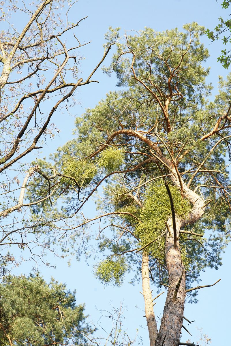 Mistelbefall... was man über die Mistel im wahren Leben sagen kann, ist weniger zauberhaft. Der Kleinstrauch mit dem botanischen Namen Viscum album schmarotzt auf Bäumen; er bohrt seine Saugwurzeln in Kiefern, Tannen und Laubhölzer wie Pappeln und Robinien, zapft die Leitungsbahnen seiner Wirte an und entzieht ihnen Nährstoffe - vor allem aber große Mengen Wasser. Jetzt, bei stetig steigenden Außentemperaturen, wird der wärmeliebende Parasit offenbar zum Totengräber von Wäldern auf Trockenstandorten, die durch den Klimawandel schon heute in akute Wasser- und Existenznöte geraten.