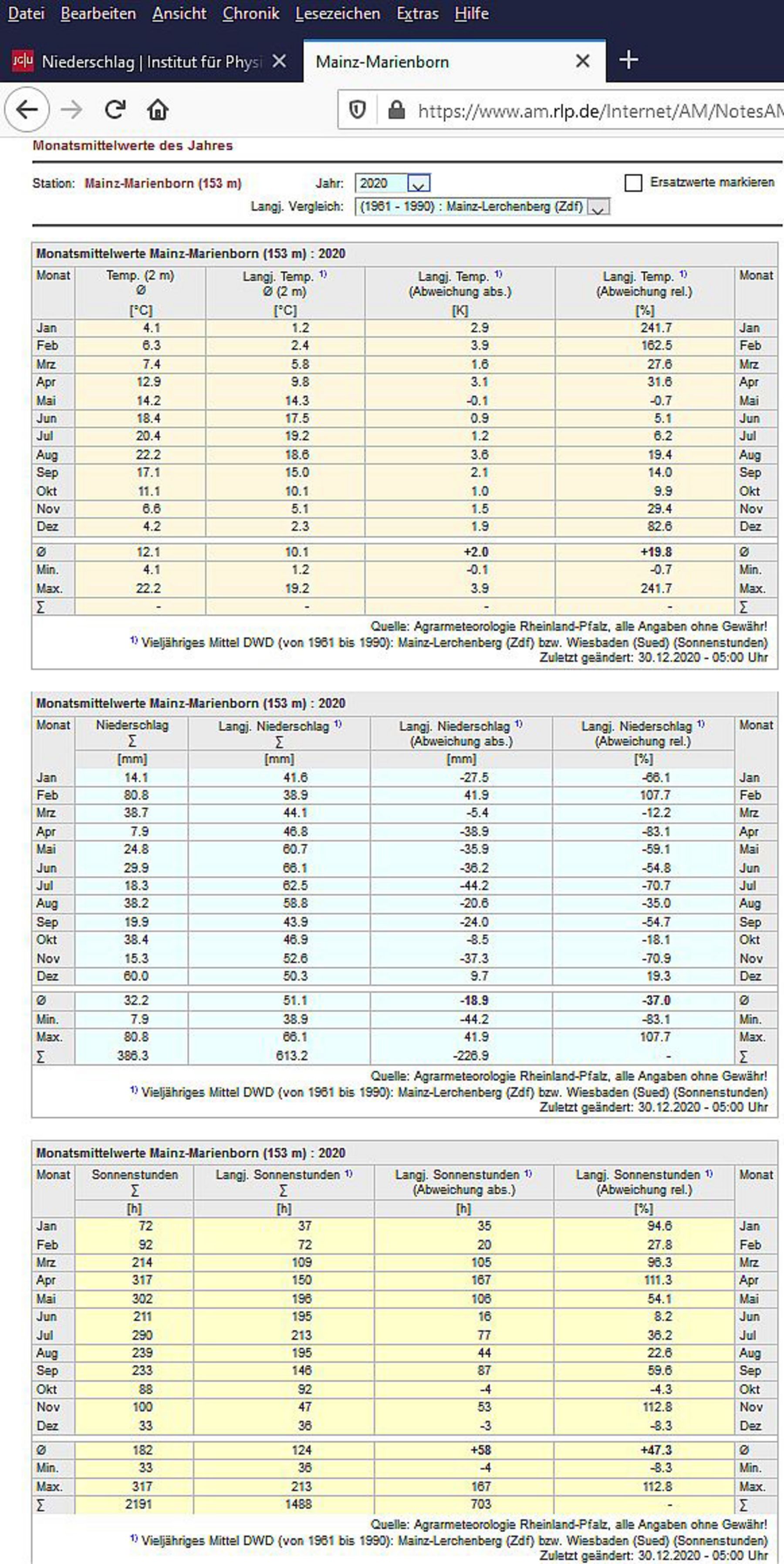 Anbei ein Screenshot der Agrarmeteorologie in MZ, die einen Langzeitvergleich erstellt hat zu Temperatur, Niederschlag und Sonnenstunden.