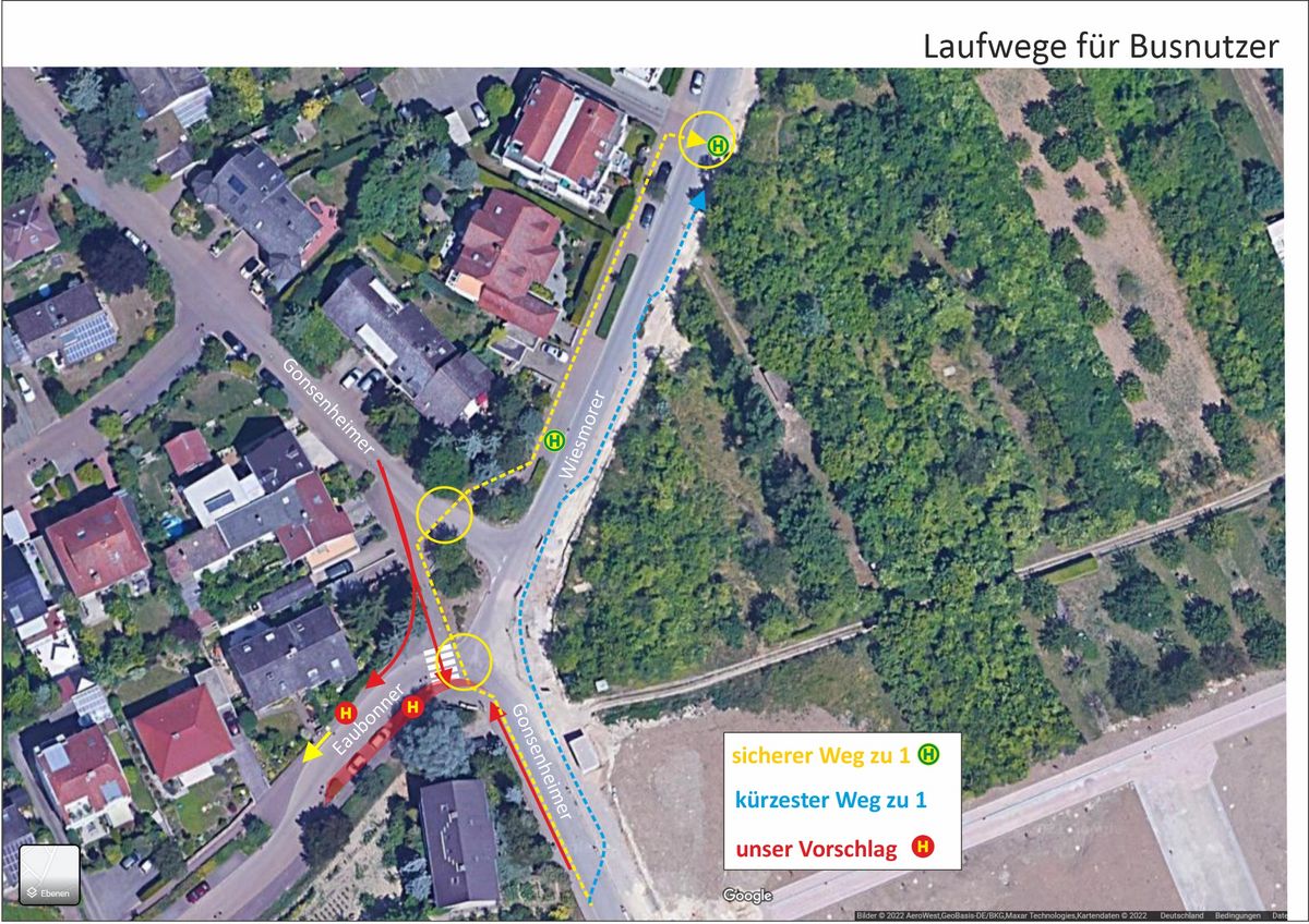 Folglich würden die Busnutzer den "blauen" und kürzesten Weg nehmen, der über die Fahrbahn oder über private Grundstücke führt. Beides kann nicht erwünscht sein. Zum einen aus Sicherheitsgründen und zum anderen, weil der Konflikt mit dem Grundstücksbesitzer der Wiese vorprogrammiert wäre.