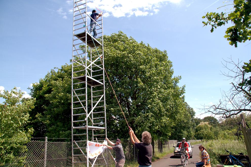 (21.05.2009) Mit der Aktion „Hier: Keine Häuser“ machte die Grüne Liste am Sonntag auf die geplante Bebauung Gonsenheimer Str. / Am Horn aufmerksam. Mit einem neun Meter hohen Gerüst konnte interessierten Spaziergängern und Fahrradfahrern beeindruckend das Ausmaß der geplanten Wohnbebauung anschaulich gemacht werden. Neun Meter: das ist die laut Bebauungsplan erlaubte Firsthöhe. » mehr