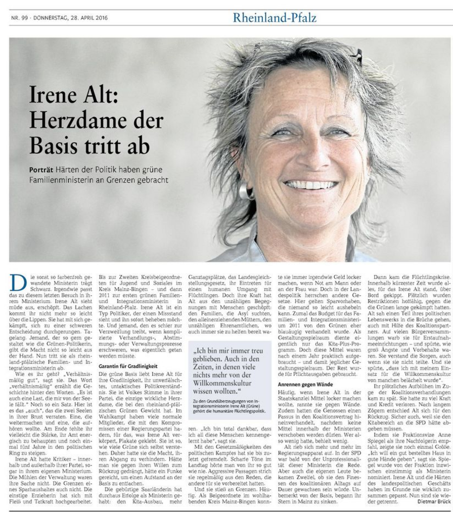 22.04.2016: Irene Alt gibt Ministeramt auf.