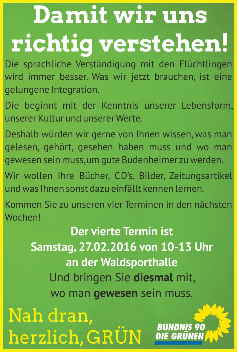 Die Ministerin für Integration  Irene Alt gab am letzten Donnerstag bei einer Veranstaltung der Budenheimer GRÜNEN einen beeindruckenden Bericht darüber, was in den letzten beiden Jahren in Rheinland-Pfalz in der Flüchtlingsarbeit geleistet wurde. Neben der Arbeit der hauptamtlich Beschäftigten gebe „es in Rheinland-Pfalz eine gute Unterstützung durch die Vereine, die Kirchen, die Schulen,  durch Bürgerinnen und Bürger, die sich engagieren.“ Dafür empfinde sie große Dankbarkeit. mehr