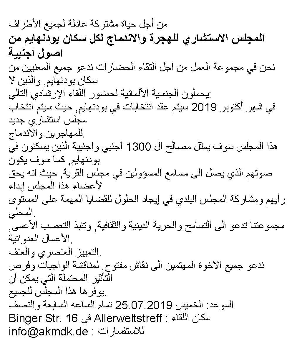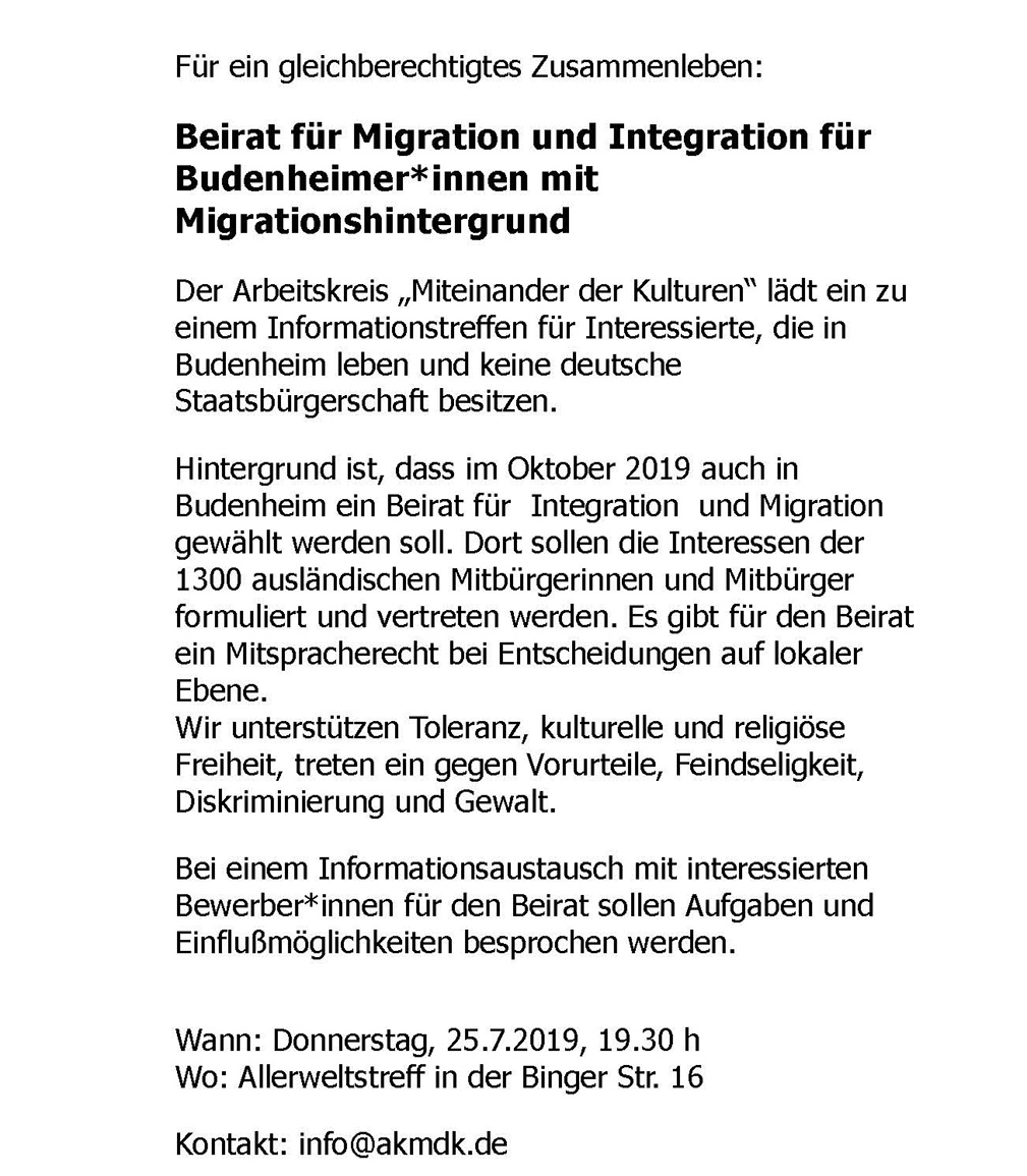 Am 27.10.2019 können über 1300 Budenheimer mit Migrationshintergrund den aus 5 Personen bestehenden Beirat für Migration und Integration wählen. Hierzu veranstaltete der Arbeitskreis Miteinander der Kulturen am 25.7.eine Infoveranstaltung. Die Einladung dazu sehen sie hier.
