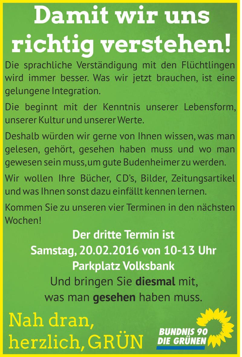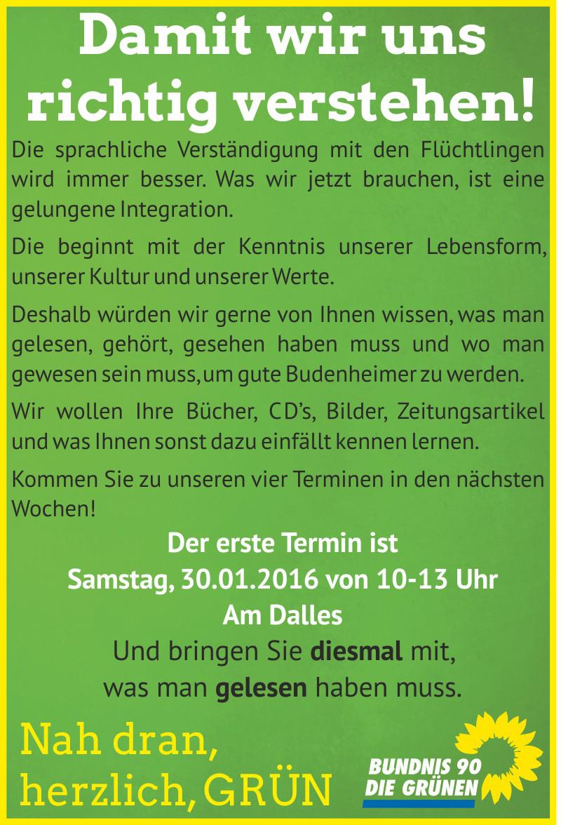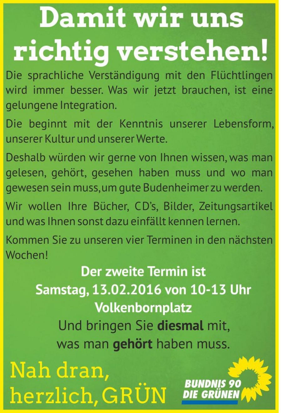 Am letzten Samstag starteten die Budenheimer GRÜNEN ihre Aktion ‚Damit wir uns richtig verstehen!’. Die GRÜNEN wollen von den Budenheimern wissen, was man als Flüchtling ge-lesen, gehört oder gesehen haben muss um unsere Lebensform, unsere Kultur und unsere Werte kennen zu lernen. Die Aktion wird an vier Samstagen durchgeführt. Der erste Aktions-tag stand unter dem Motto ‚Was man gelesen haben muss ….‘ .