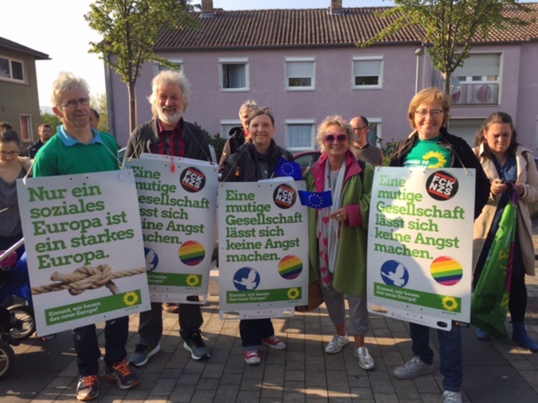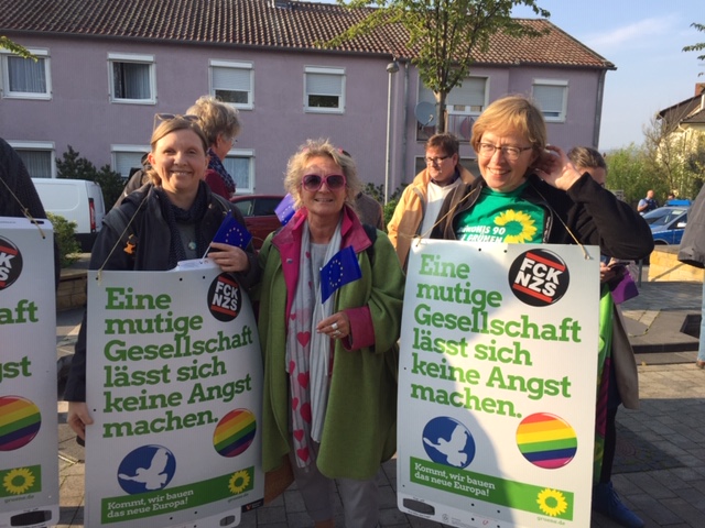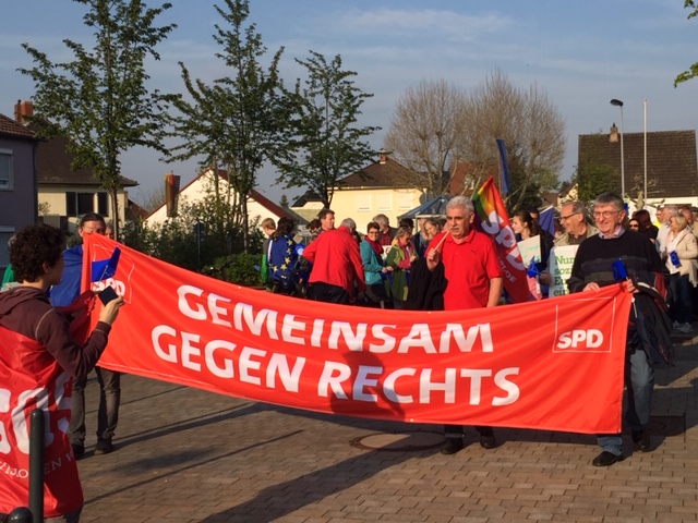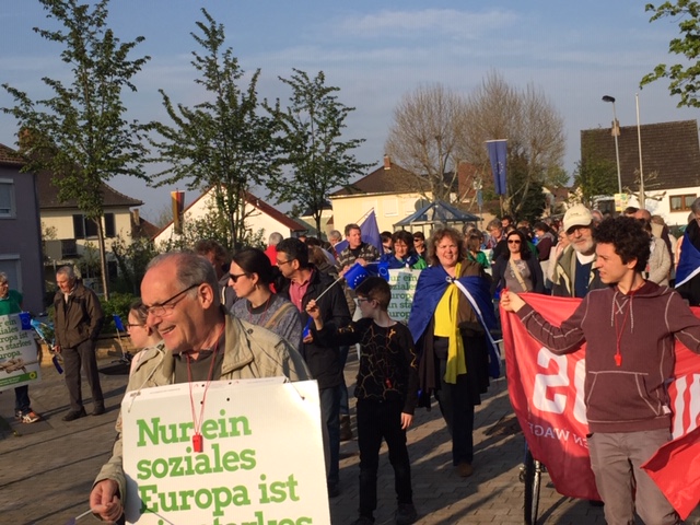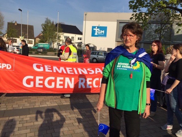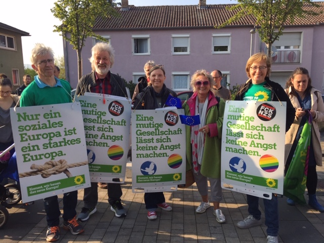 Die Budenheimer Grünen und die SPD haben aufgerufen und an die 100 Budenheimerinnen und Budenheimer kamen, um "Flagge" zu zeigen. Flagge für ein starkes einiges Europa. Gegen den Auftritt der AFD in Budenheim.