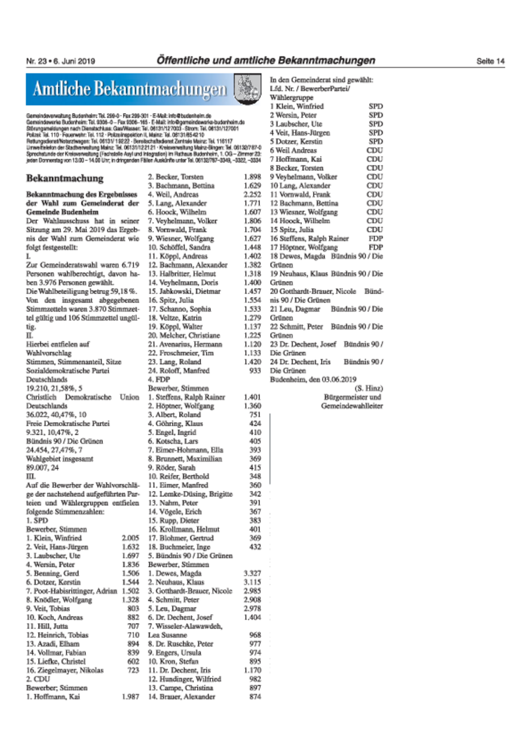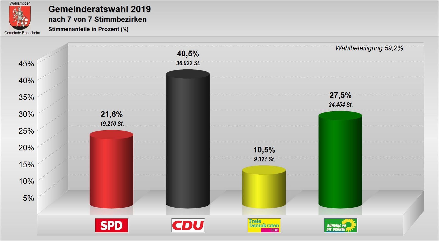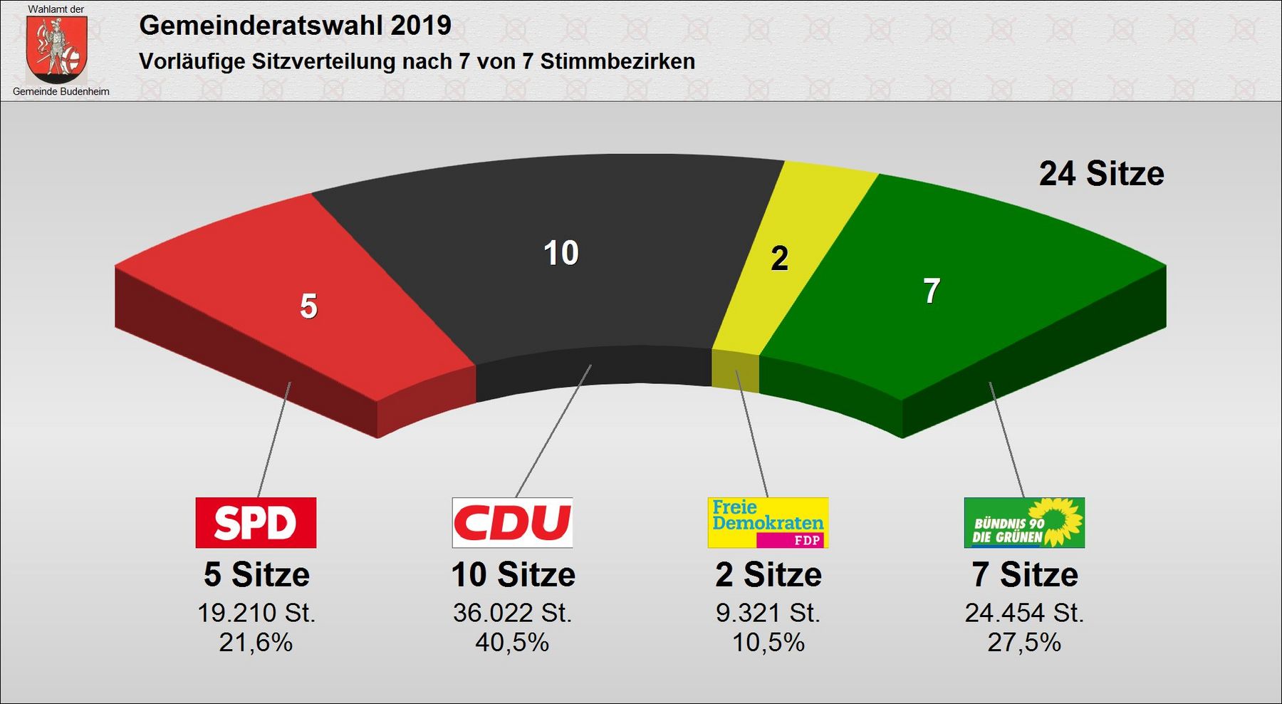 27,5 % sind ein tolles Ergebnis für die GRÜNEN, die als einzige politische Kraft in Budenheim dazugewonnen hat. Doch was ändert sich nun im Rat? CDU und FDP kommen auf 12 Sitze, SPD und GRÜNE ebenso. Mit der Bürgermeisterstimme, die immer dann eingreift wenn Abstimmungen unentschieden ausgehen, hat die alte Koalition aus CDU und FDP die Mehrheit knapp behauptet.