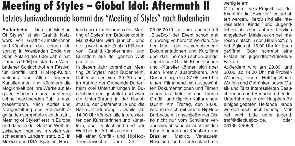 Dank der Initiative des Budenheimer Jugendtreffs BlueBox kommt das große Grafitti Fest "Meeting of Styles" nach Budenheim und die Künstlerinnen und Künstler an der Spraydose werden sich bei uns die Budenheimer Bahnunterführungen vornehmen.