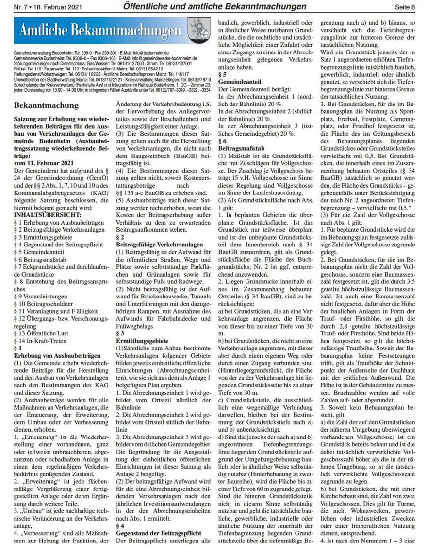 In seiner Sitzung vom 11.02.2021 hat der Verwaltungsrat die Satzung für die Erhebung wiederkehrender Beiträge in Budenheim rückwirkend beschlossen.
