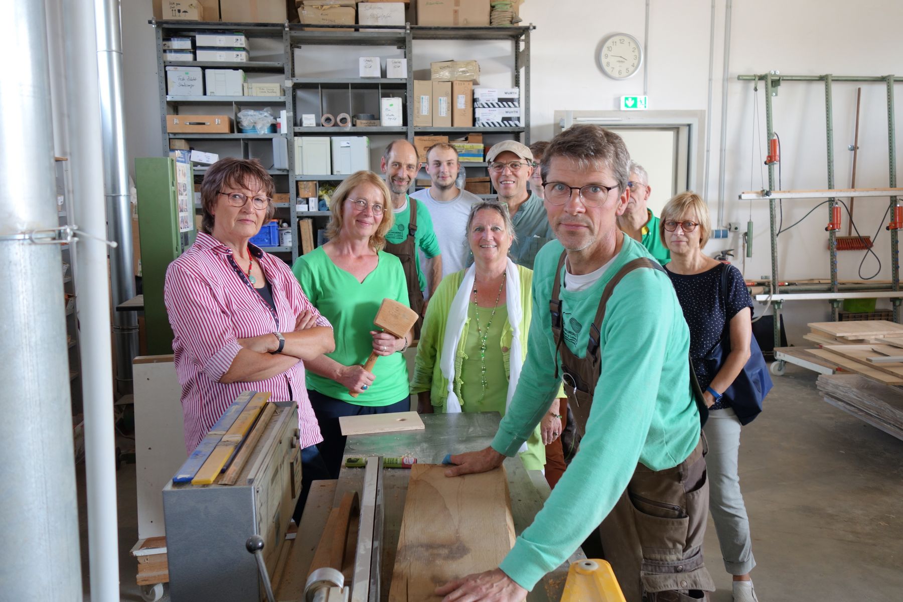 Tabea Rößner und einige Interessierte wurden von den Inhabern durch den Betrieb geführt, und der Fertigungsprozess vom Rohholz bis zur z.B. zur geölten Tischplatte erläutert. In den Aufenthaltsräumen gleich ein erstes Novum, man teilt sich diesen Raum, der eher an eine moderne Wohnküche erinnert, mit den anderen gewerblichen Mietern im Haus, betreibt sozusagen „Roomsharing“, was nicht nur Kostenvorteile mit sich bringt.