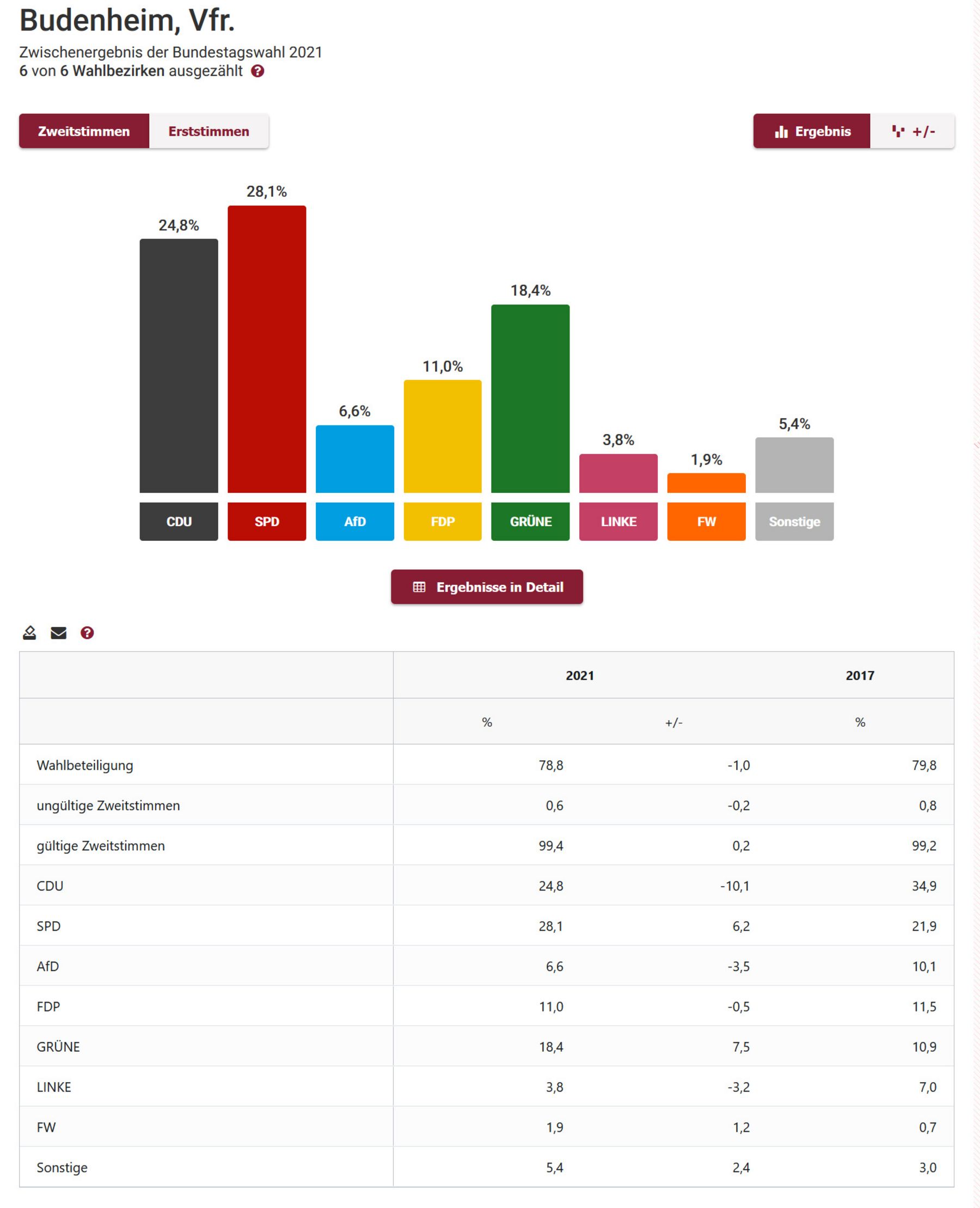 CDU verliert in Budenheim 2-stellig (-10,1), GRÜNE legen mit +7,5% am meisten zu, SPD gewinnt mit + 6,2 %. Scheitern mit Ansage: FREIE WÄHLER und SONSTIGE, sammeln in Budenheim zusammen 7,3%. Dieser recht hohe Stimmenanteil geht verloren, da die Splitterparteien allesamt deutlich an der 5% Hürde scheitern.