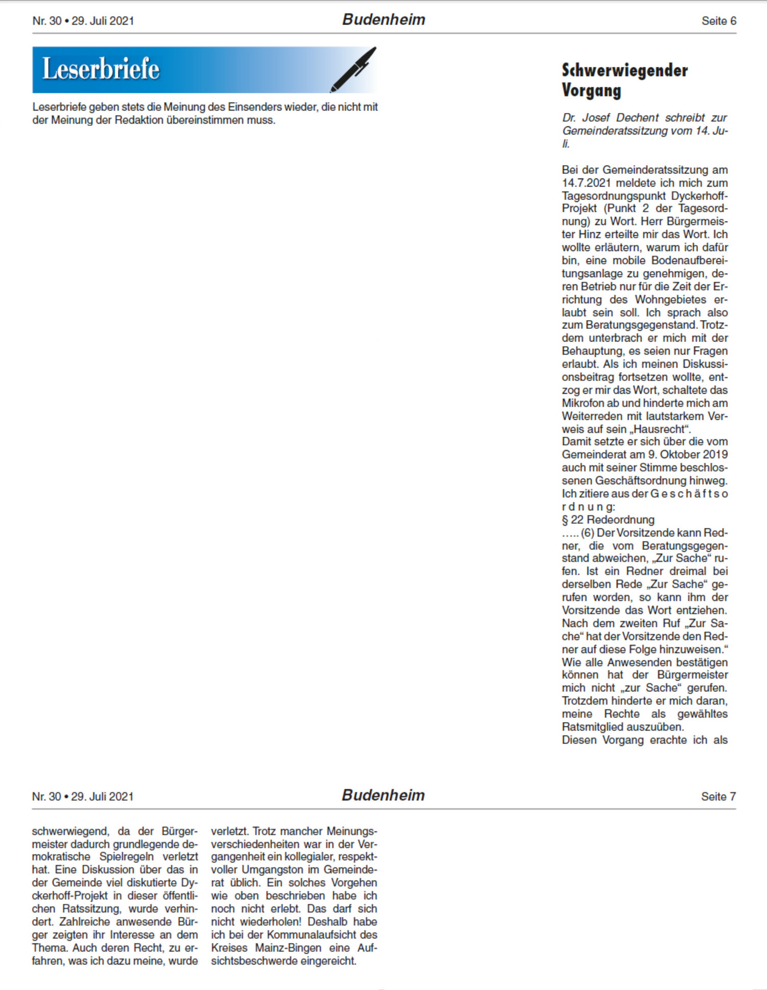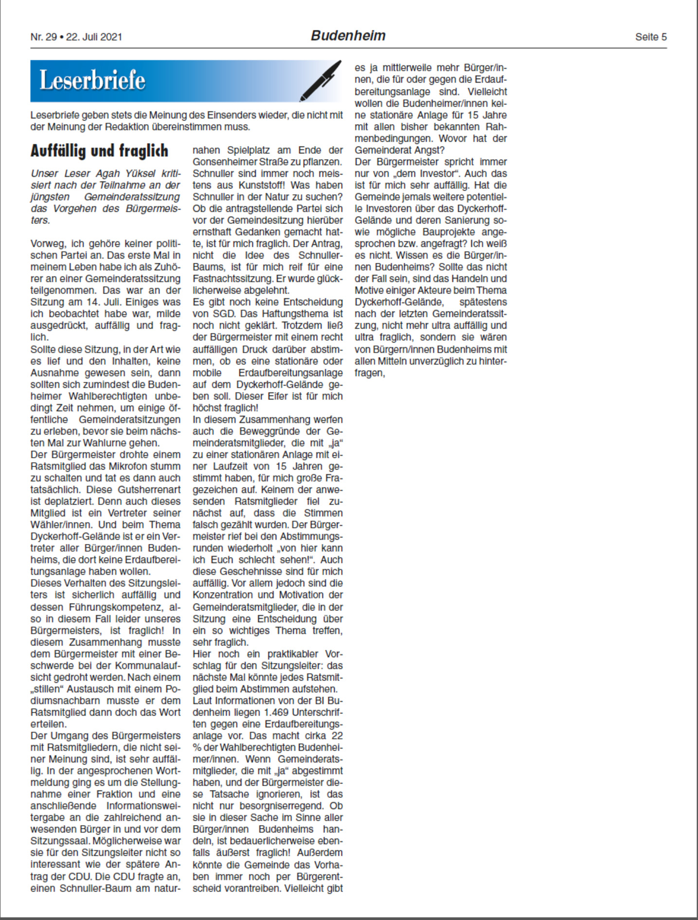 Ein von mir dazu formulierter ► Leserbrief erschien am 29.7.2021 in der Heimatzeitung