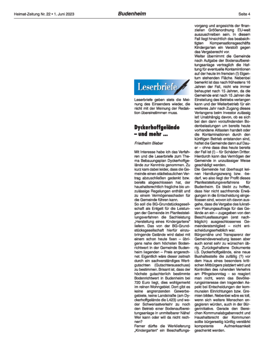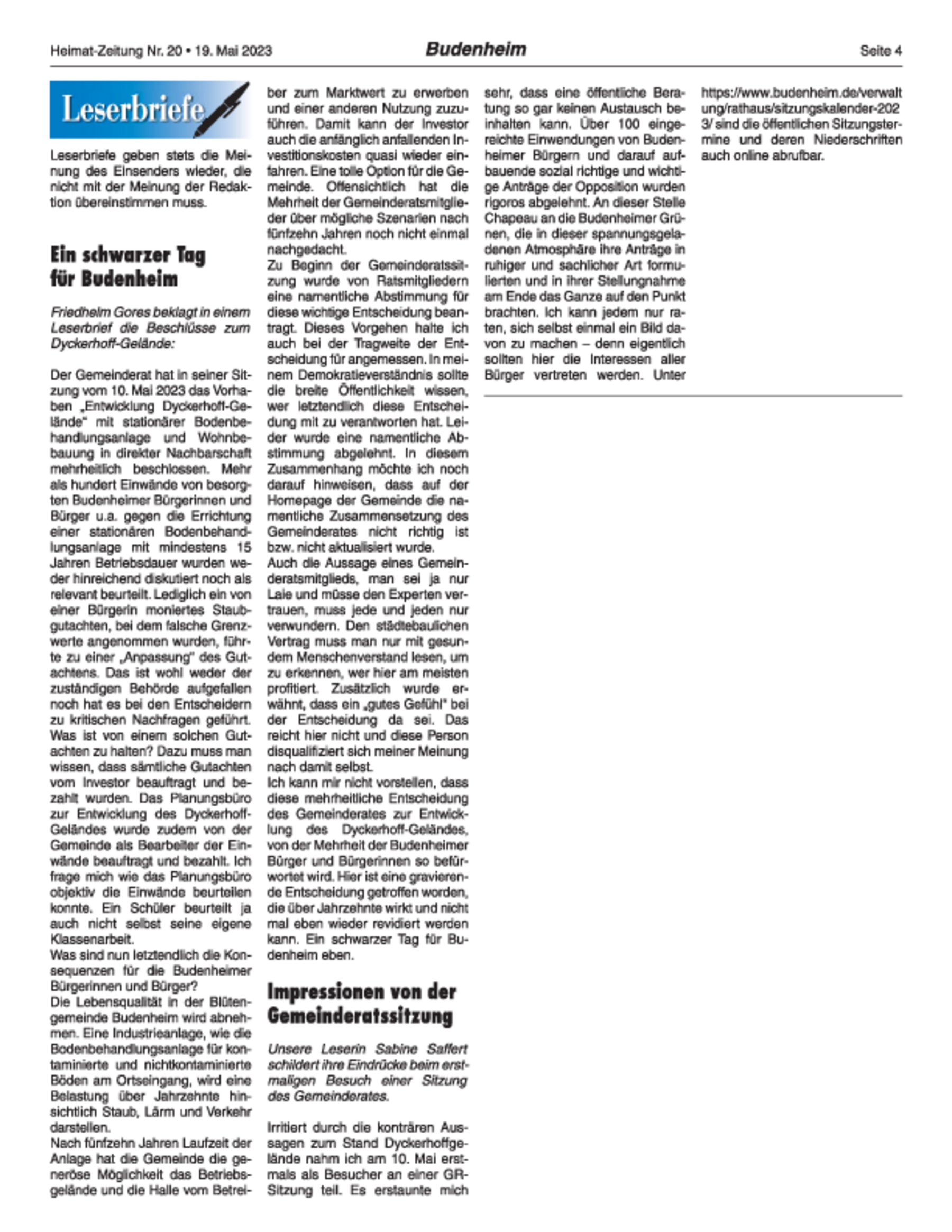 - 19.05.2023: Bürgerreaktionen in der Heimat-Zeitung