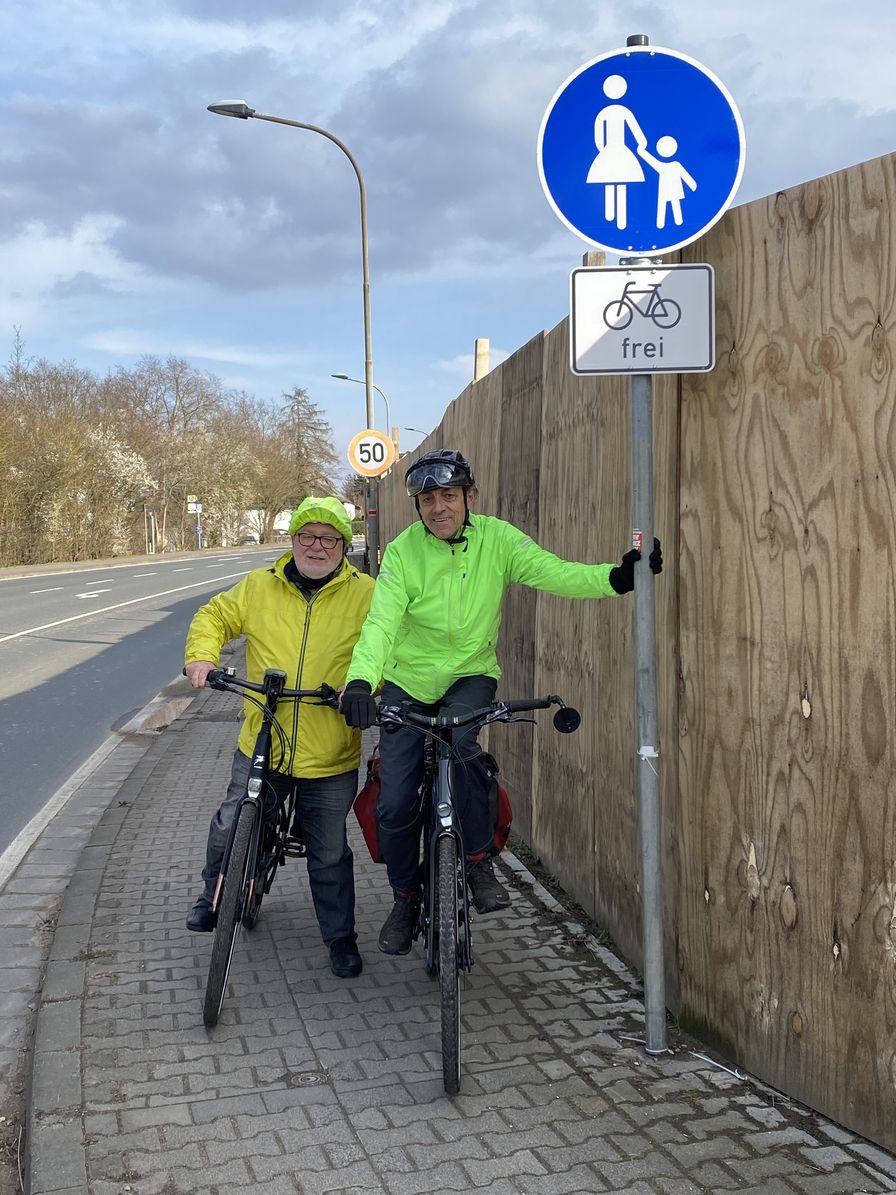 Es hat ja lange gebraucht, bis zumindest die Beschilderung korrigiert wurde. Peter Schmitt und Jo Dechent, die sich lange schon dafür eingesetzt haben, stehen mit Ihren Bikes und in voller Radlermontur unter der neuen Beschilderung, die zwar den Radweg nicht besser macht, aber Radler*innen, sollten diese auf der Fahrbahn fahren, was nunmehr erlaubt ist, zumindest nicht mehr pauschal schuldig spricht, sollte es zu einem Unfall kommen, was durch die alte Beschilderung stets der Fall war. Der Inverstor hat ebenfalls zugesichert, mehr Transparenz Ecke Schwarzenbergweg und Mainzer Landstraße herzustellen, d.h. den blickdichten Bretterzaun transparenter zu gestalten.