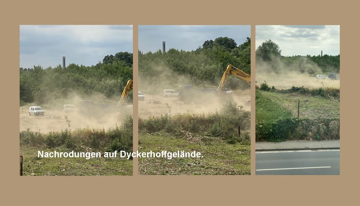 Eigentlich liegt ja noch keine Antwort der genehmigenden Behörde vor, was den Investor jedoch nicht davon abhält, weitere Nachrodungen auf dem besagten Gelände anzustellen. Das aufgrund der anhaltenden Trockenheit jede Menge Staub aufgewirbelt wird, der die Anrainer geradezu einnebelt wäre an sich schon ein Grund, die Baustelle stillzulegen. Solche Emissionen werden aber im Bauwesen als gottgegeben und somit vollkommen normal angesehen. (Wer mal eine Zeit lang neben einer Baustelle gelebt hat, kennt das zur Genüge.) Da es sich aber bei dem Gelände, wie reichlich bekannt sein dürfte, um mehr oder weniger stark belastete Böden handelt, mit deren Sanierungsvorhaben der Investor sich ja ins Geschäft gebracht hat, ist der Umgang in der sichtbaren Weise schon eine besondere Dreistigkeit. Oder ist es einfach nur Dummheit der Handelnden vor Ort? In jedem Fall ist es ein Versäumnis des Investors, hier keinerlei Vorkehrungen zum Schutz seiner Mitarbeiter, als auch der Anlieger getroffen zu haben. Das Misstrauen wächst.