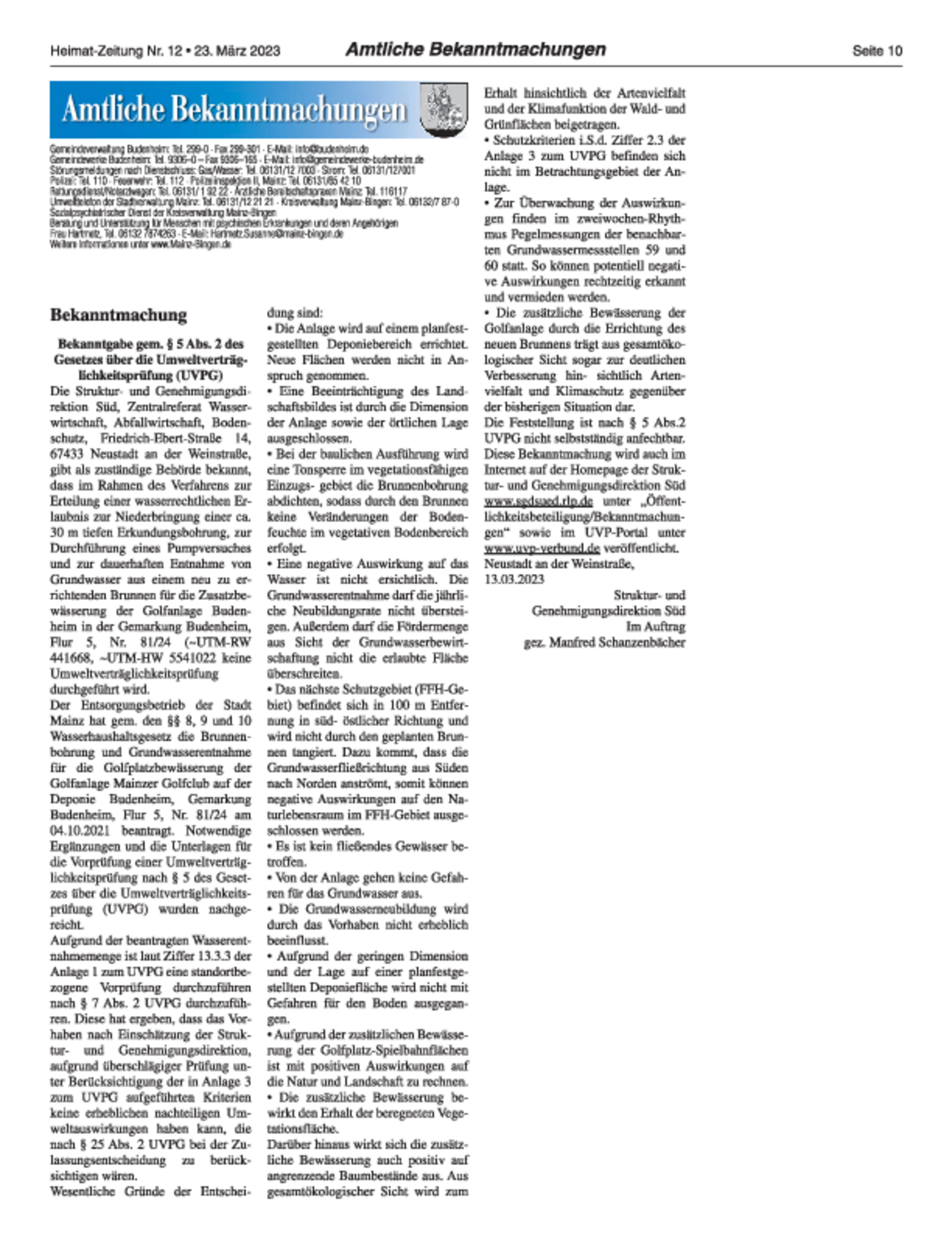 Wir erhielten auf unsere Anfrage aus dem April bei der SGD aufgrund der amtlichen Mitteilung in der HZ (vom 23. März 2023, siehe unten auf dieser Seite) aufschlussreiche Antworten. In der Budenheimer Verwaltung wusste man von dem Sachverhalt nichts, da diese überhaupt nicht in das Genehmigungsverfahren einbezogen wurde. Das wurde dann nachgeholt und so auch in das Gremium des "Zweckverband Lennebergwald" getragen. Dieses Gremium mit dem Mainzer OB Nino Haase und dem aktuell Vorsitzenden BM Hinz an der Spitze hat sich nun in letzter Sitzung (► siehe Bericht in der HZ, dort gelb markiert) gegen die zusätzliche Grundwasserentnahme durch den Golfplatz ausgesprochen.