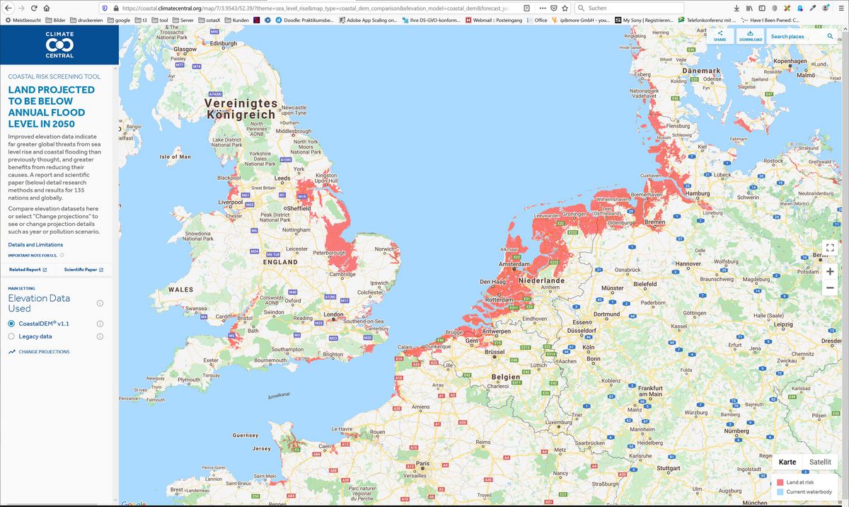 Die Forscher sagen, das liegt daran, dass die meisten Geländemodelle auf Daten der Nasa beruhen. Die erfassen allerdings nicht die Höhe des tatsächlichen Untergrunds, sondern die höchsten Punkte - also oft Hausdächer und Baumspitzen. Sie haben ein korrigiertes Geländemodell entwickelt und mit Meeresspiegelprognosen verschiedene Zukunftsszenarien berechnet. Wie die Lage im Jahr 2050 aussehen wird, kann man sich im Netz auf einer Karte ansehen.