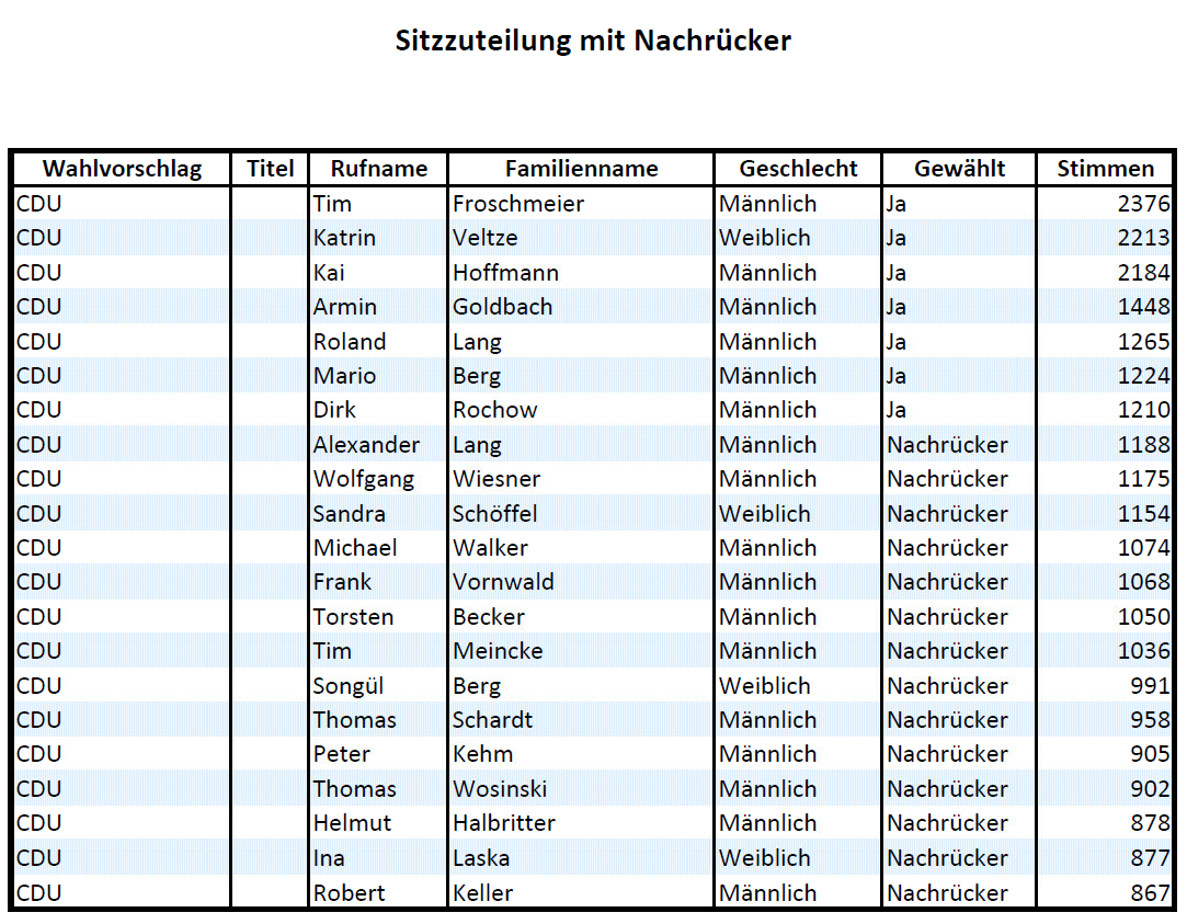 - Die FDP (-1 Sitz / -4,7 % = 5,8%) verliert 1 von 2 Sitzen und damit den Fraktionsstatus, folgedem auch alle Sitze in den Ausschüssen.
