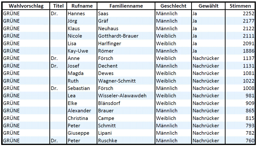 17 neue Ratsmitglieder*innen, davon leider nur 3 weiblich, bilden mit 7 Mitglieder*innen des alten Rats (davon 2 weiblich) den neuen Rat. Die 7 Altmitglieder sind: von der CDU: Kai Hofmann, von uns GRÜNEN: Klaus Neuhaus und Nicole Gotthardt-Brauer, von der SPD: Peter Wersin, Winfried Klein und Kerstin Dotzer und von der FDP: Wolfgang Hoeptner