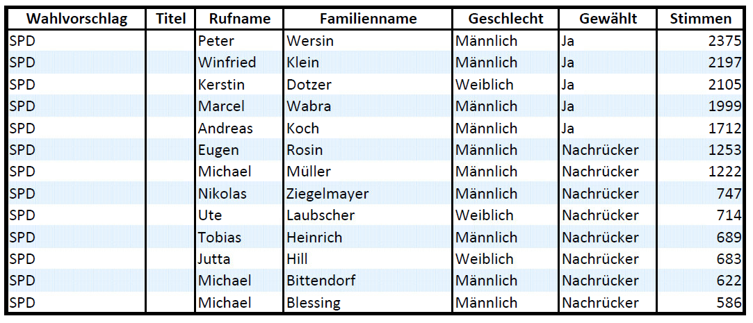 - Die SPD (unverändert / -3,1 % = 18,5%) kann trotz 3,1% Verlust knapp die 5 Sitze halten.
