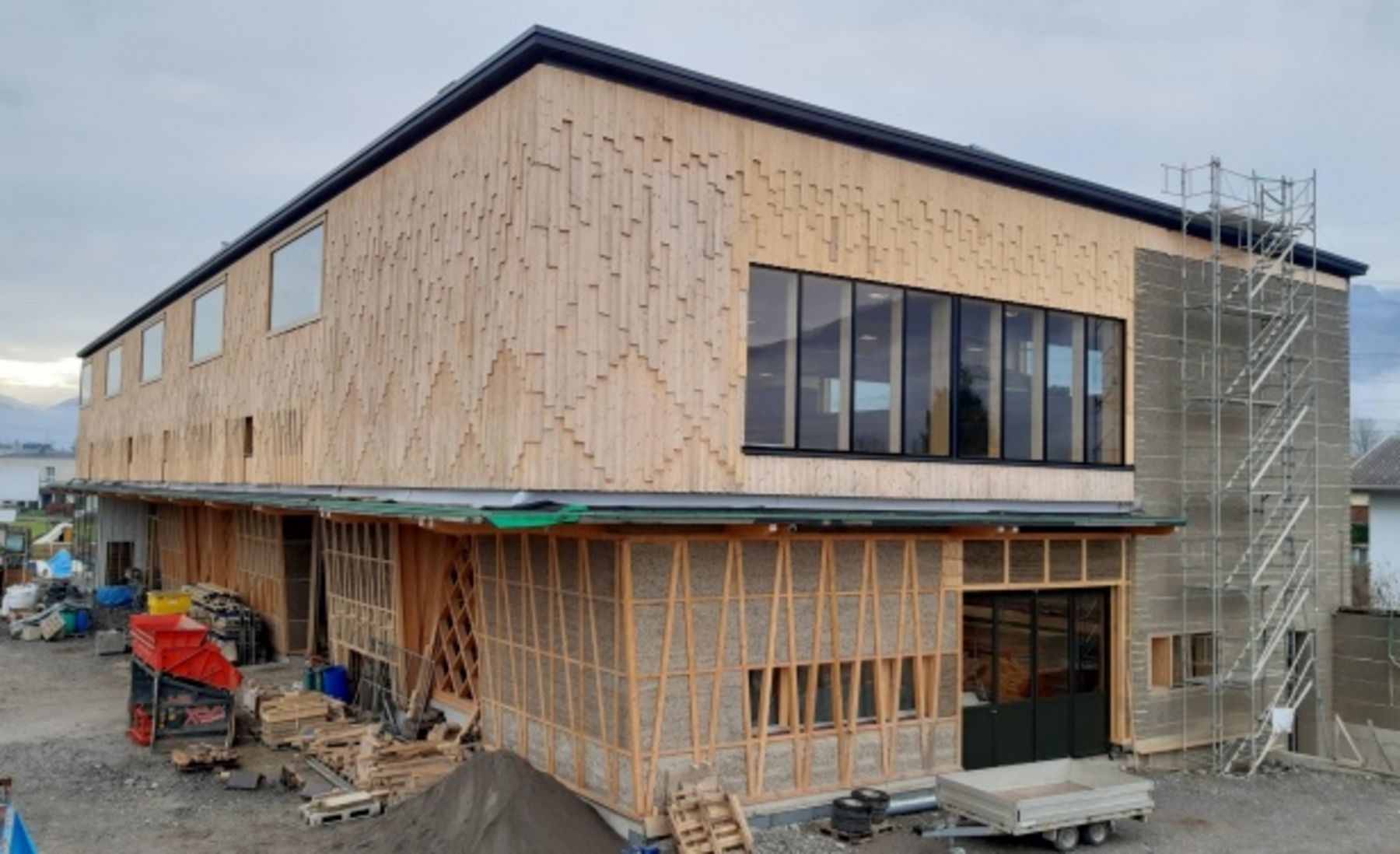 Die „Lehm-Ton-Erde Baukunst GmbH" baut seit Mai 2019 eine neue Werkhalle und integriertes Planungsbüro als zusätzliche Produktionsstätte für die Herstellung von Stampflehmprodukten in der Gemeinde Schlins in Vorarlberg.