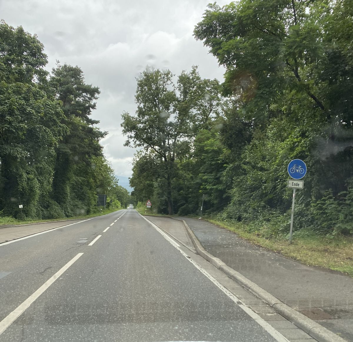 Mit Ausnahme des Kurvenbereichs am Forsthaus darf 100 km/h gefahren werden. (Siehe Bild) Einen Radweg gibt es nicht. Diese hohe Geschwindigkeit birgt ein großes Gefahrenpotential bei Überholvorgängen für Radfahrer und auch für Autofahrer durch Wildwechsel, erst recht, wenn es im Winter dunkel ist.