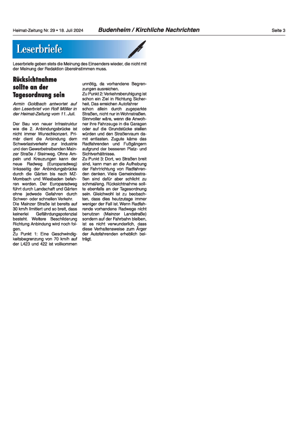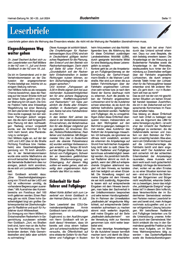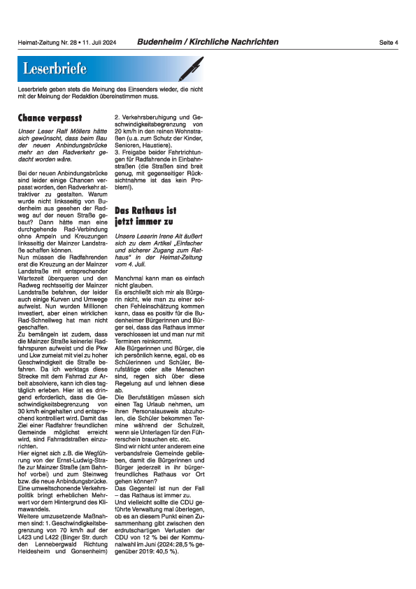 In der Heimatzeitung vom 11. Juli 2024 äußerte Herr Ralf Möllers richtige Gedanken zum Radverkehr in Budenheim.