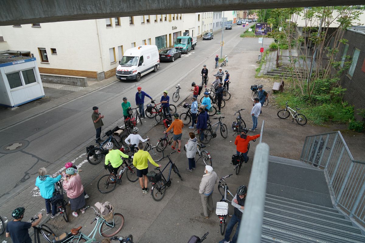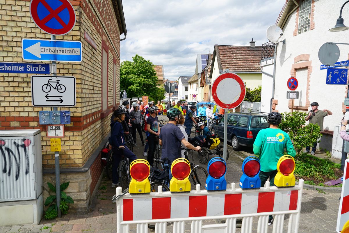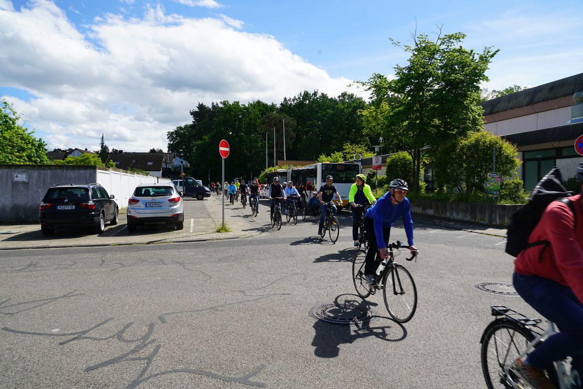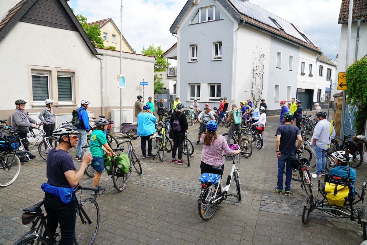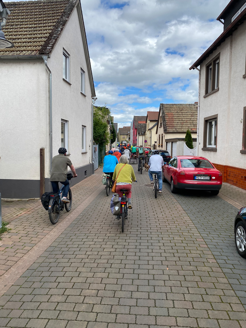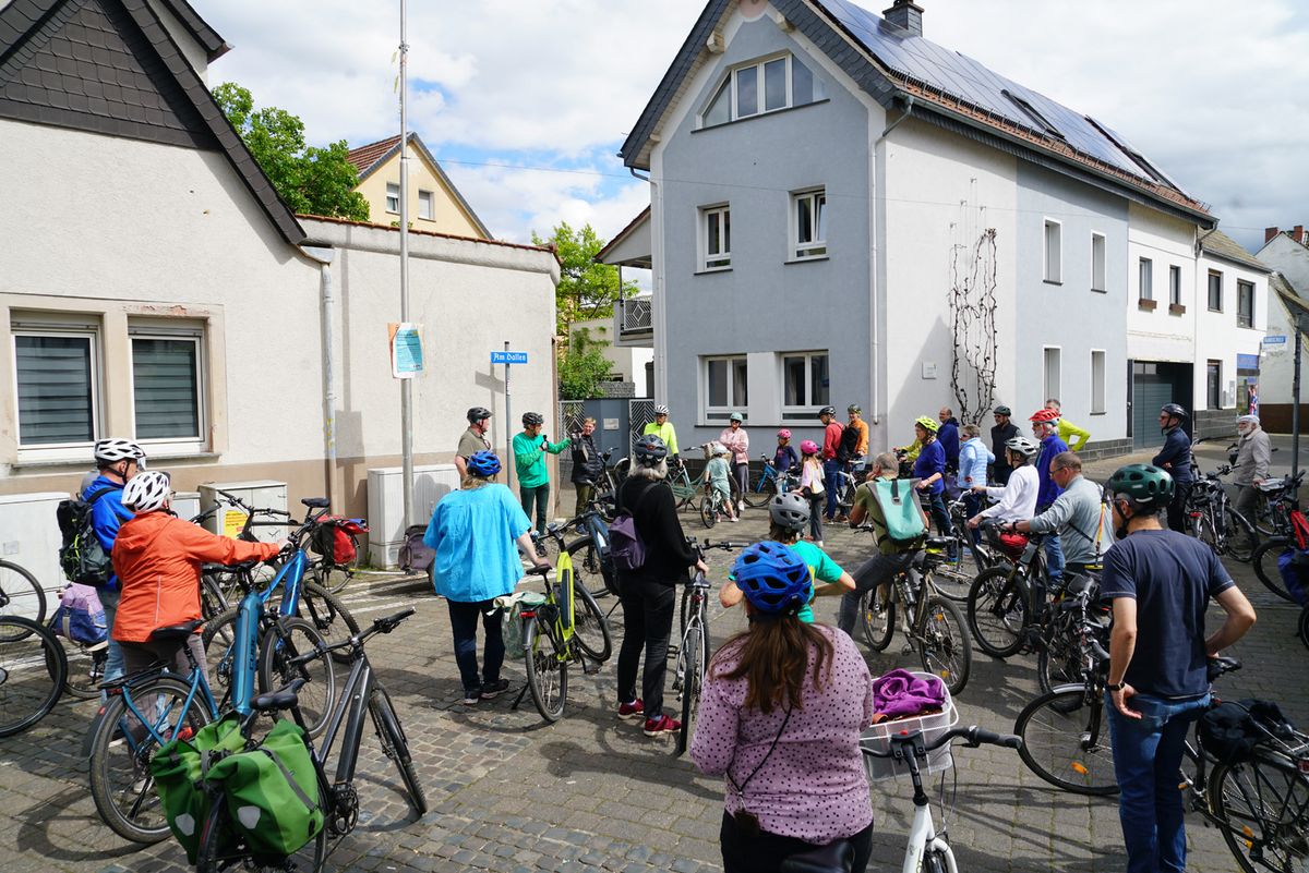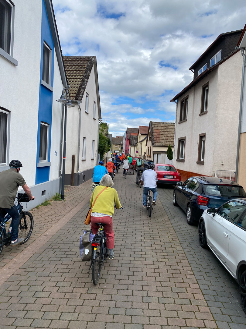Mit rund 50 Teilnehmer*innen von jung bis alt startete die Tour nach einer kurzen Ansprache von Kay Römer an der Waldsporthalle. Kay Römer und Jo Dechent haben die Tour ausgearbeitet. Sie führte zu neuralgischen Punkten für Radler*innen in Budenheim. Erste Station war das Rathaus mit seinem fürchterlichen Felgenverbieger, der anstatt an einen Radständer an einen Tauchsieder erinnert, der aus dem Boden schaut. Auch die unglückliche Verkehrsführung in der Margarentenstraße wurde dort angesprochen. Der Radstreifen auf der linken Seite (Blickrichtung Binger Str.) ist nur in Richtung Rathaus für Radfahrer zu nutzen, nicht jedoch, wie viele Autofahrer meinen, auch für Radler in Richtung Binger Straße. Das Rechtsfahrgebot gilt hier auch für Radler.