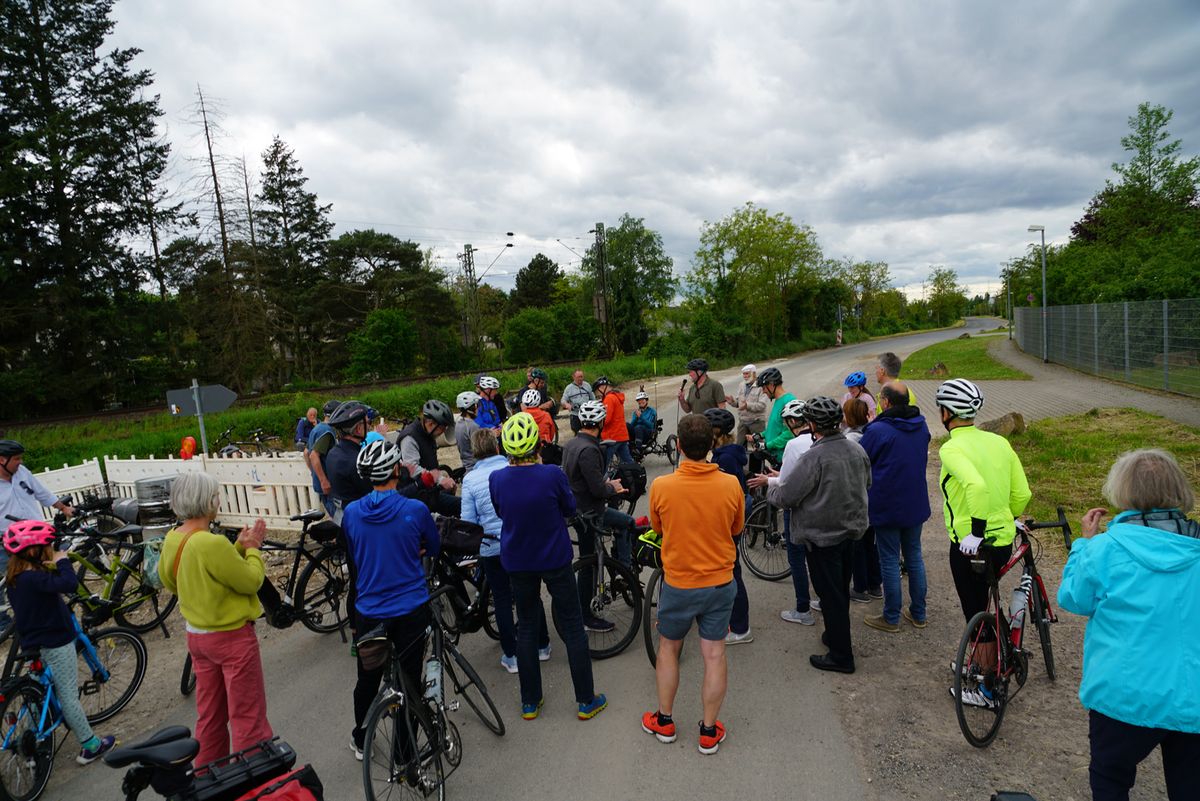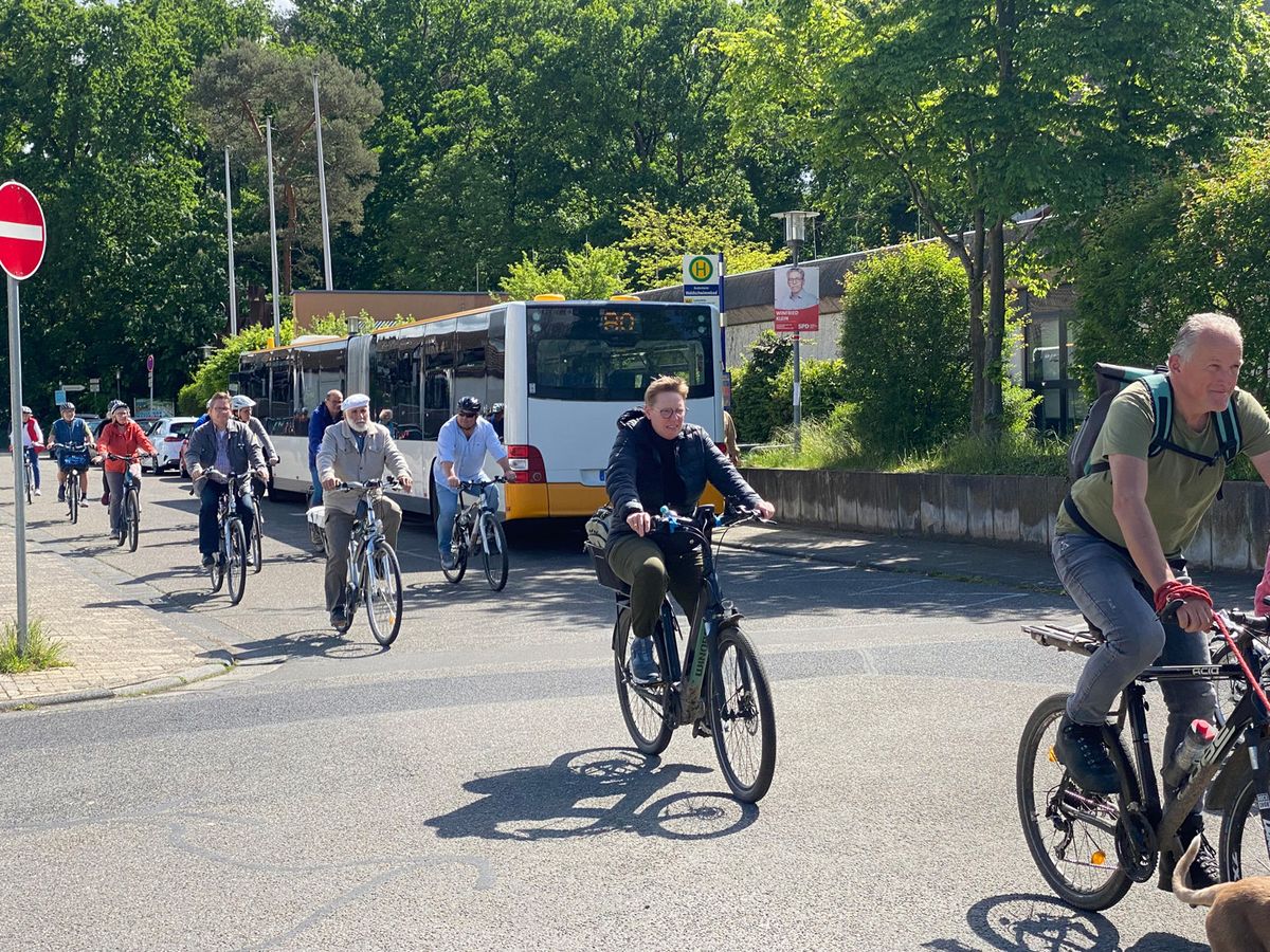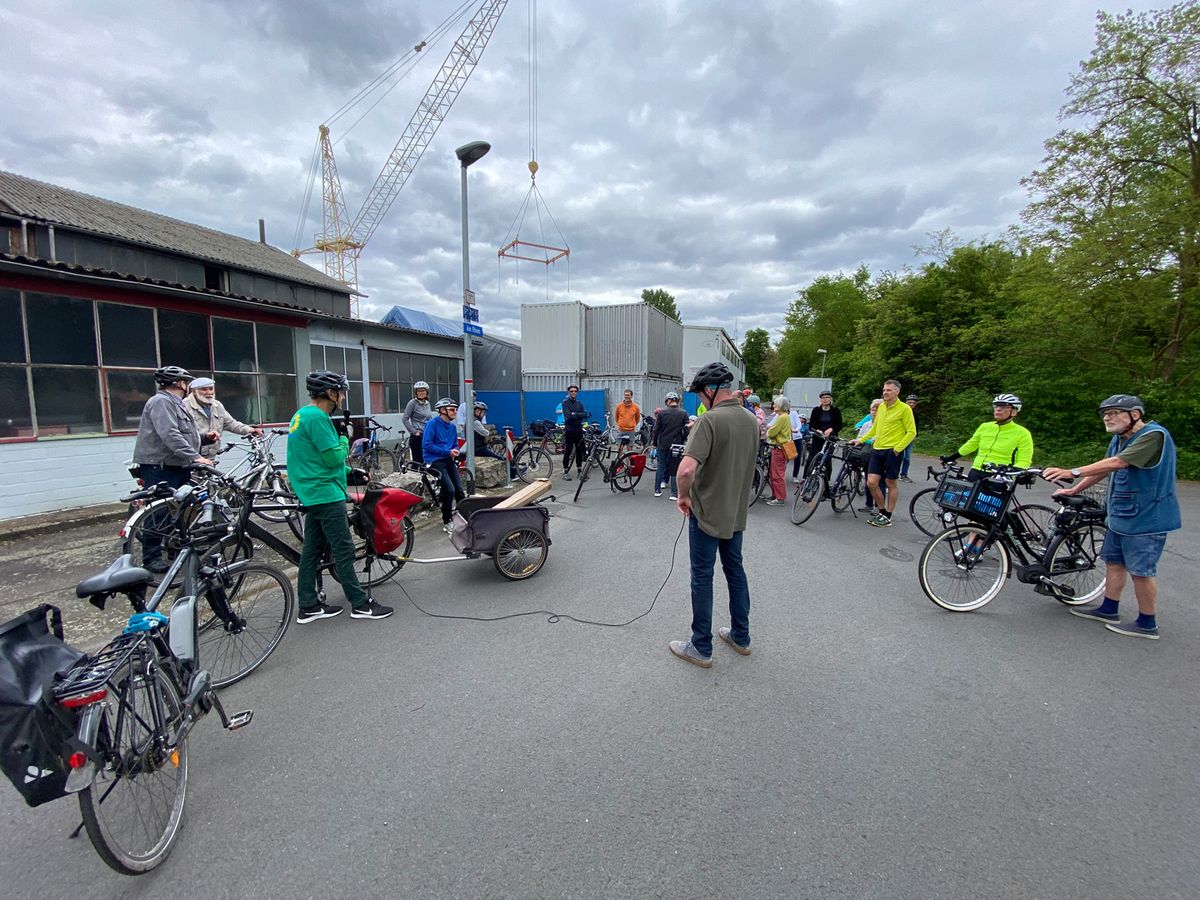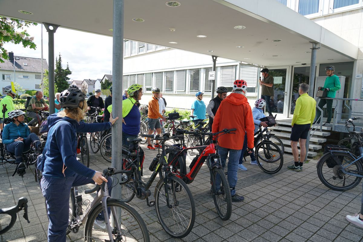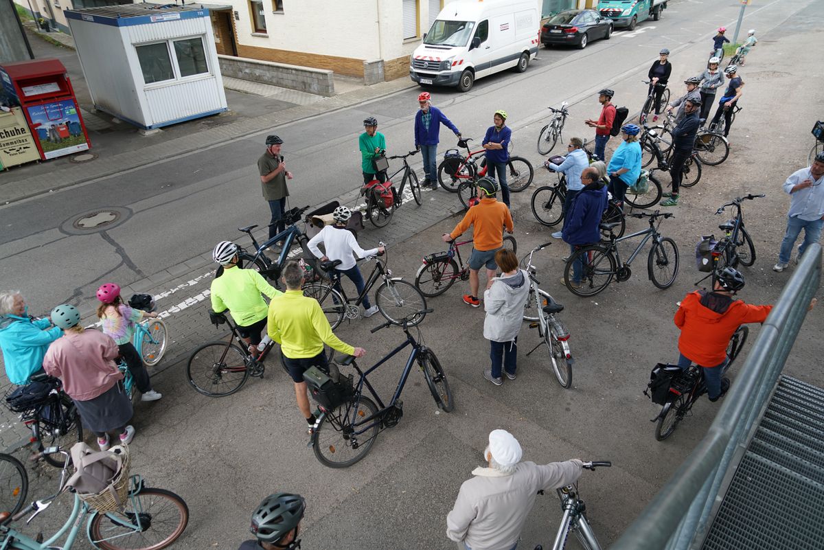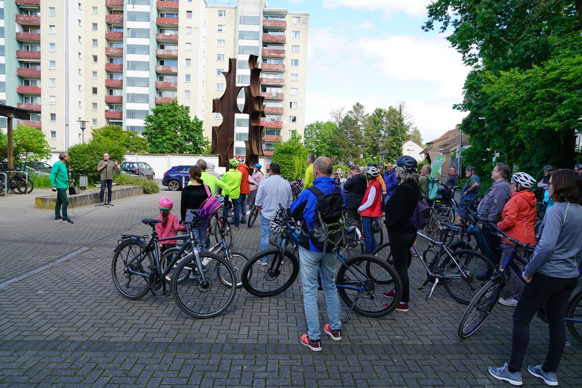 Mit rund 50 Teilnehmer*innen von jung bis alt startete die Tour nach einer kurzen Ansprache von Kay Römer an der Waldsporthalle. Kay Römer und Jo Dechent haben die Tour ausgearbeitet. Sie führte zu neuralgischen Punkten für Radler*innen in Budenheim. Erste Station war das Rathaus mit seinem fürchterlichen Felgenverbieger, der anstatt an einen Radständer an einen Tauchsieder erinnert, der aus dem Boden schaut. Auch die unglückliche Verkehrsführung in der Margarentenstraße wurde dort angesprochen. Der Radstreifen auf der linken Seite (Blickrichtung Binger Str.) ist nur in Richtung Rathaus für Radfahrer zu nutzen, nicht jedoch, wie viele Autofahrer meinen, auch für Radler in Richtung Binger Straße. Das Rechtsfahrgebot gilt hier auch für Radler.