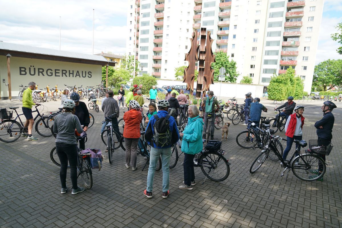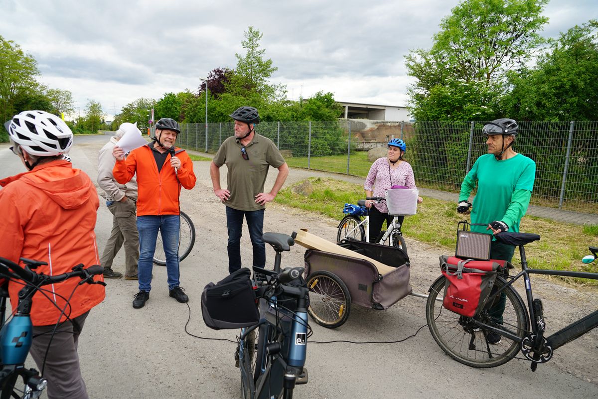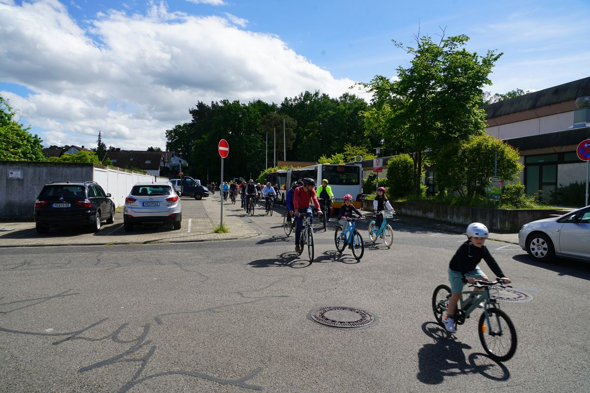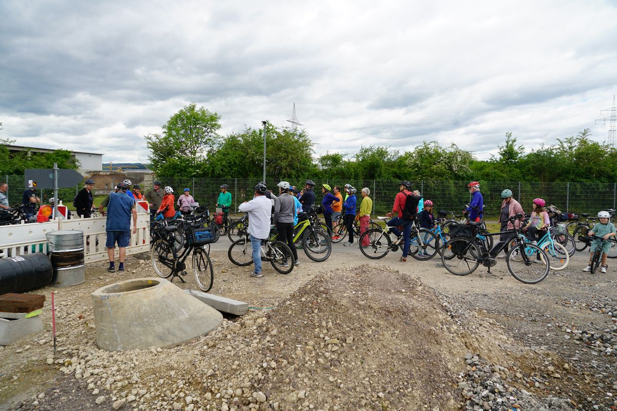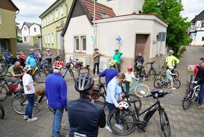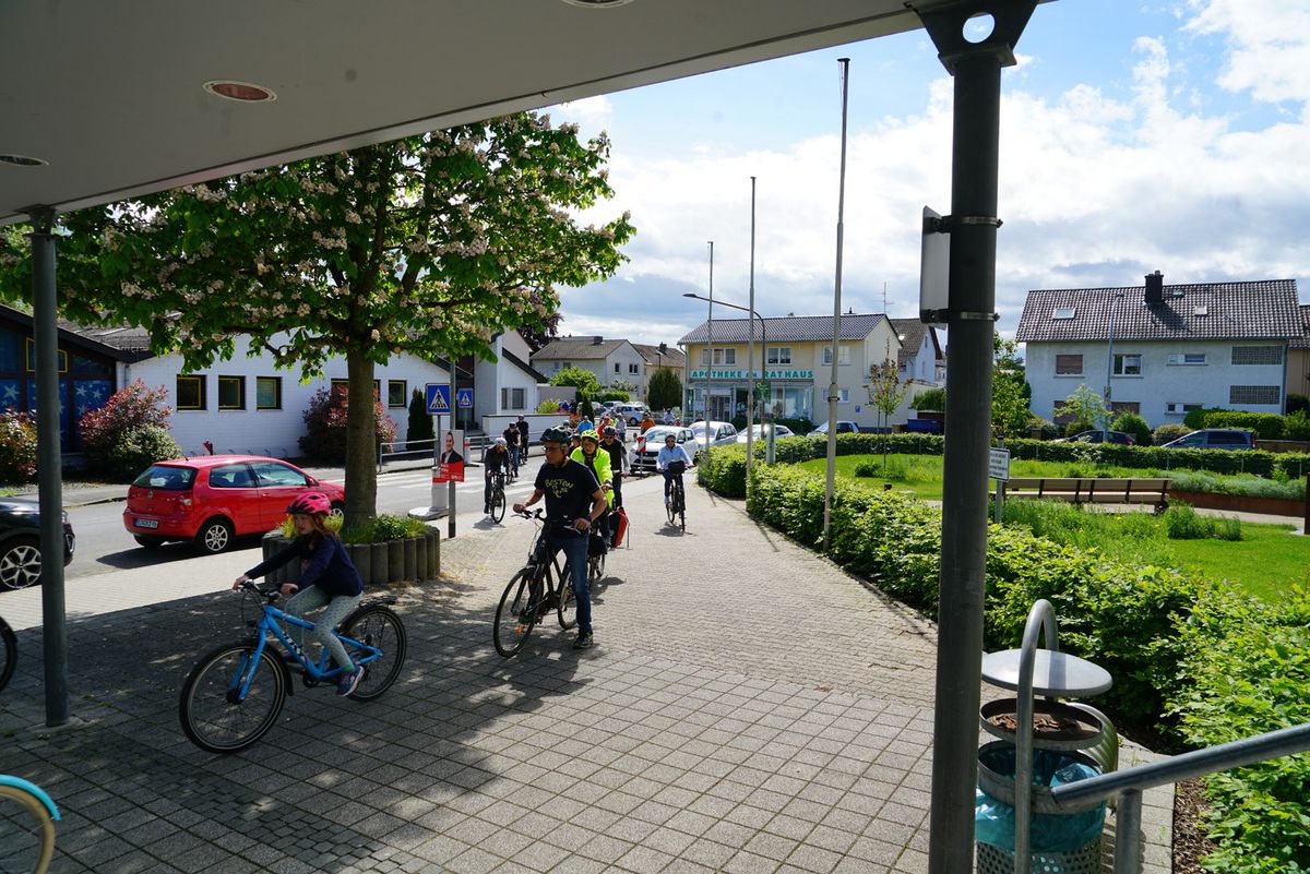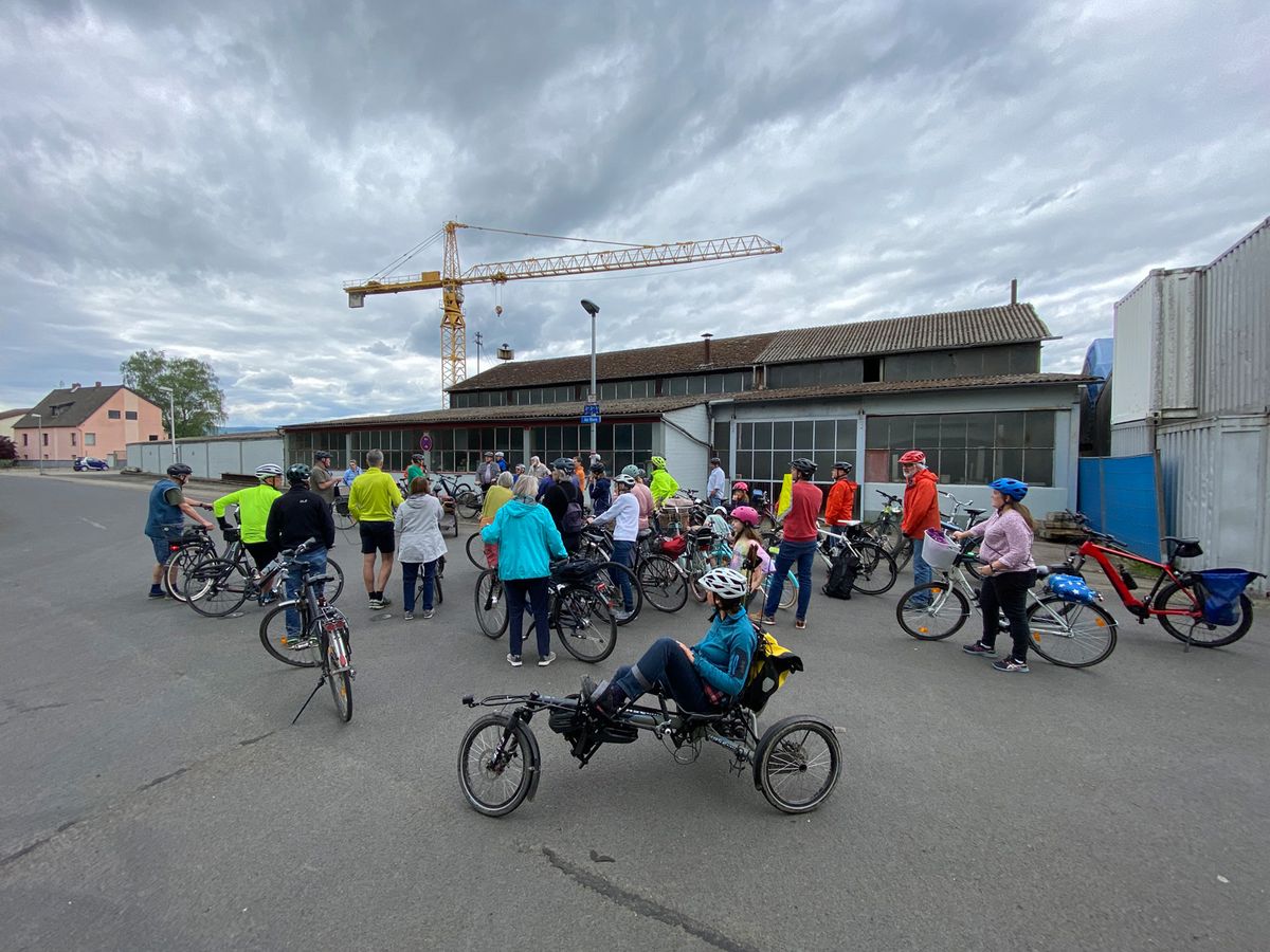 Mit rund 50 Teilnehmer*innen von jung bis alt startete die Tour nach einer kurzen Ansprache von Kay Römer an der Waldsporthalle. Kay Römer und Jo Dechent haben die Tour ausgearbeitet. Sie führte zu neuralgischen Punkten für Radler*innen in Budenheim. Erste Station war das Rathaus mit seinem fürchterlichen Felgenverbieger, der anstatt an einen Radständer an einen Tauchsieder erinnert, der aus dem Boden schaut. Auch die unglückliche Verkehrsführung in der Margarentenstraße wurde dort angesprochen. Der Radstreifen auf der linken Seite (Blickrichtung Binger Str.) ist nur in Richtung Rathaus für Radfahrer zu nutzen, nicht jedoch, wie viele Autofahrer meinen, auch für Radler in Richtung Binger Straße. Das Rechtsfahrgebot gilt hier auch für Radler.