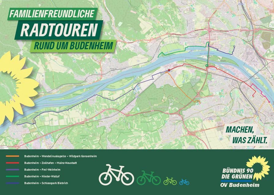 Stichworte: Abstellmöglichkeiten in Budenheim, Radwege, Radsymbole auf dem Asphalt, Fahrradbügel, Bike & Ride, Fahrradfähre, Radpendlerroute, Radtouren für Familien, etc.